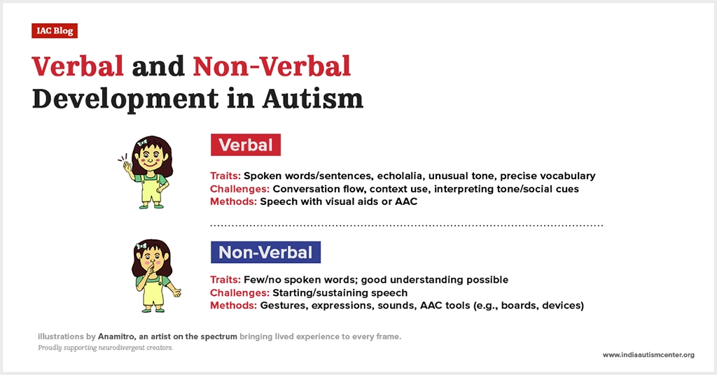 What non-verbal means | Limited, inconsistent, or absent speech | Difficulty interpreting unspoken cues (facial expressions, gestures, tone, spatial awareness) |
